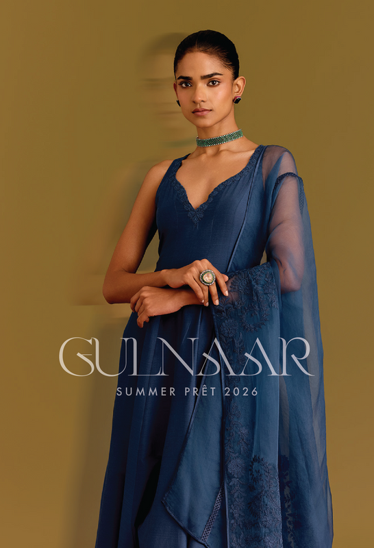 Raah is a world in motion—fluid, unbound, ever-moving. A journey outward where every step tells a story, the collection unfolds as a canvas of contrasts—light and shadow, softness and structure, tradition and modernity in harmony. Shades of blue, blush pink, summer yellow, and lilac flow alongside the grounding presence of black and white. Whisper-light chiffons, airy chanderis, and summer tussar mirror this effortless movement, adorned with resham and dori embroidery and artisanal block prints. Lines blur, boundaries dissolve, and what remains is rhythm—of fabric, of color, of a path embraced with every step.