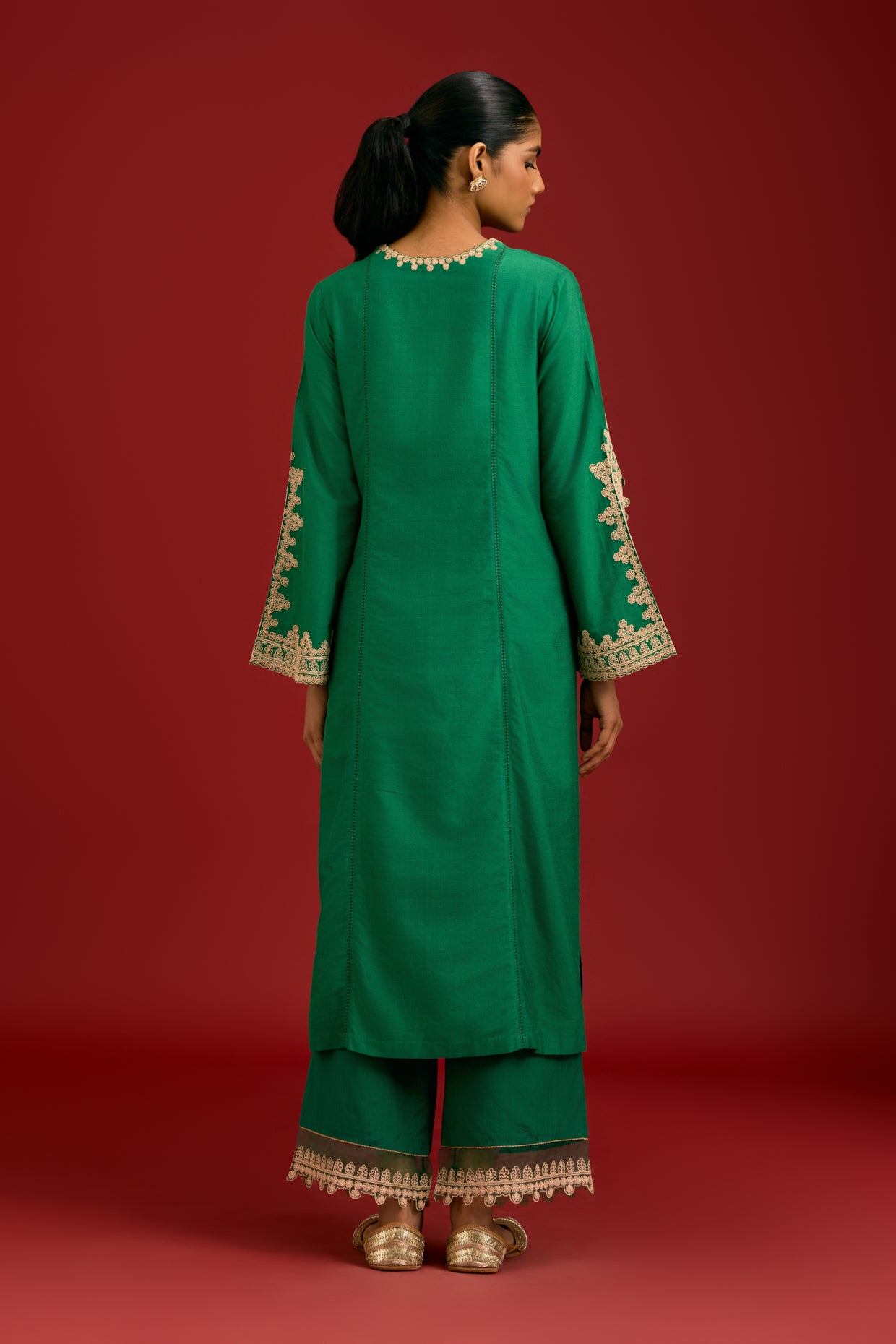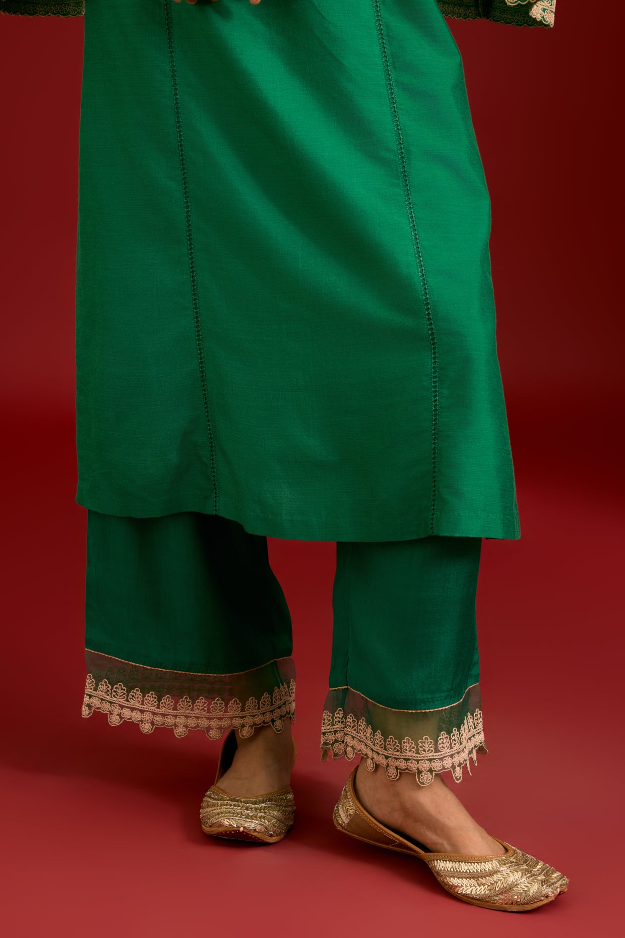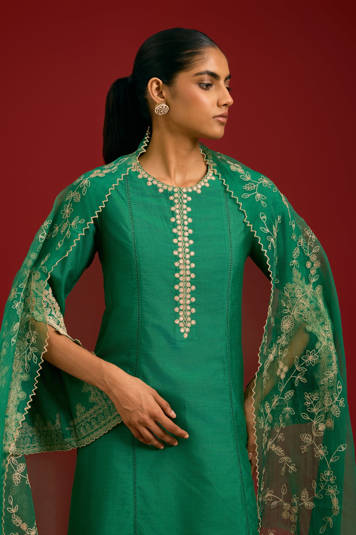 Exude refined sophistication in this dark green kurta set, crafted from luxurious cotton silk blend fabric. Intricate dori embroidery and subtle sequins accentuate the kurta's elegance, while a shantoon palazzo and delicate silk organza dupatta enhance the ensemble's poise and grace.