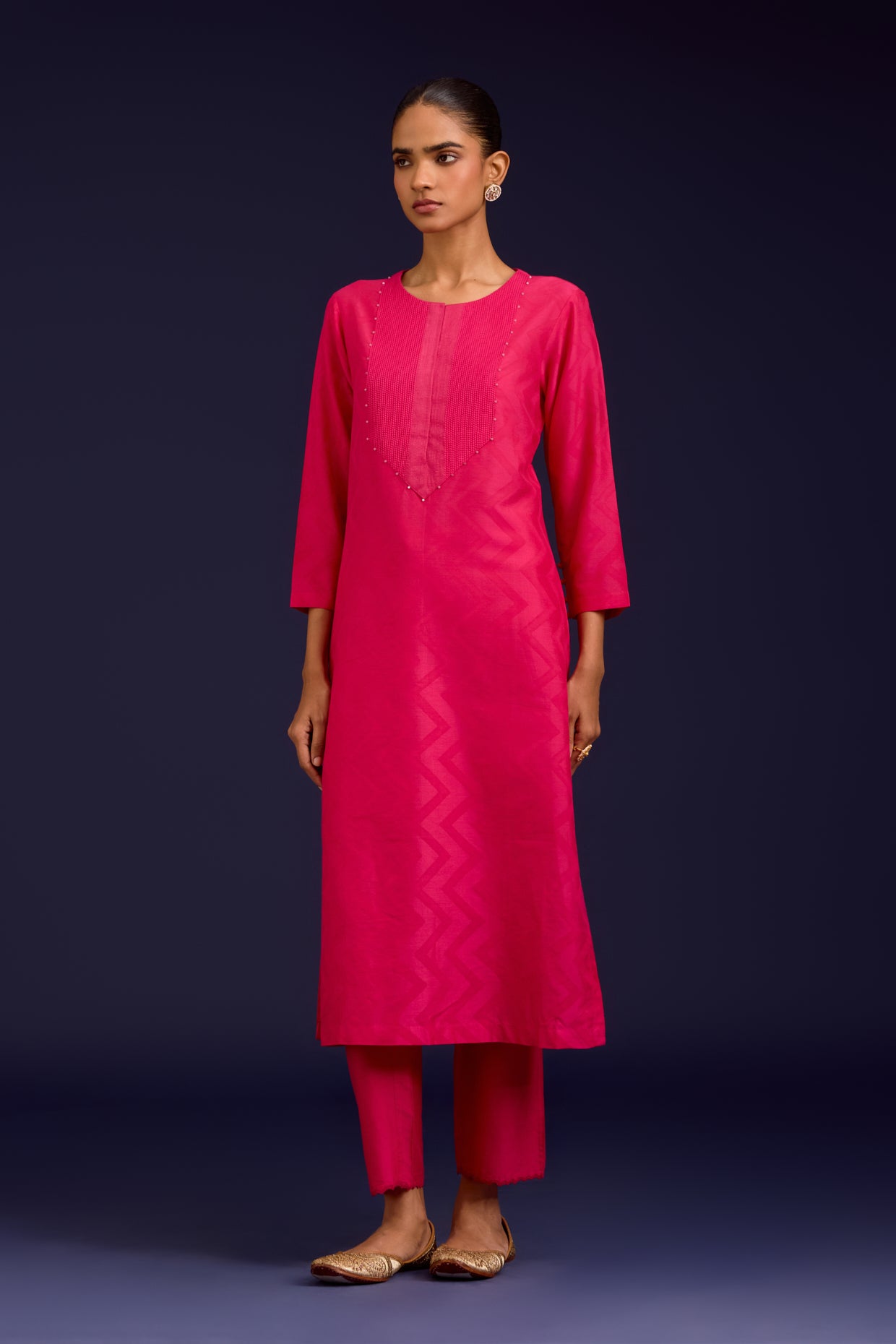 Fuchsia Cotton Silk Blend Block Printed Kurta Set