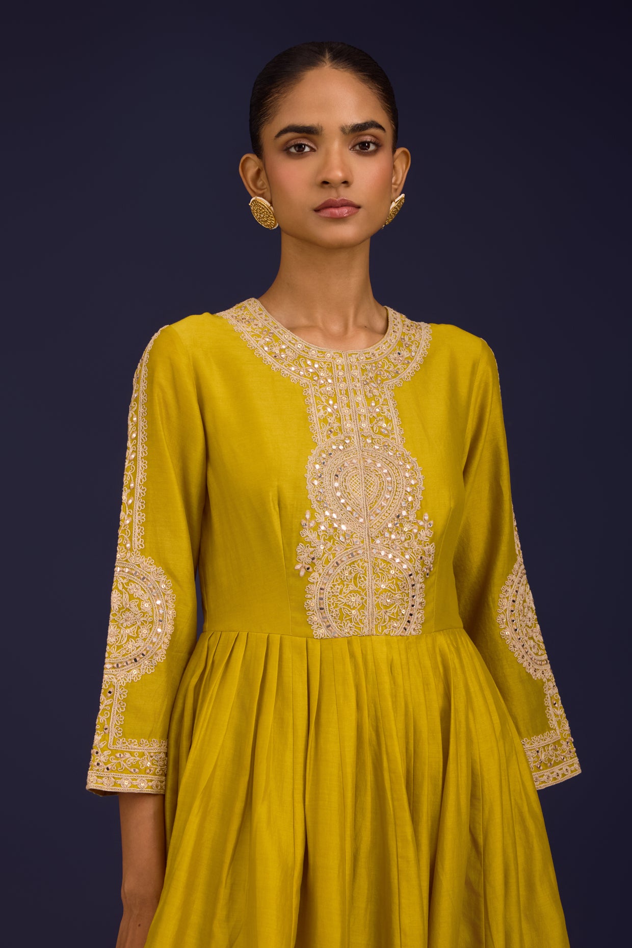 Mustard Silk Chanderi Embroidered Anarkali Set