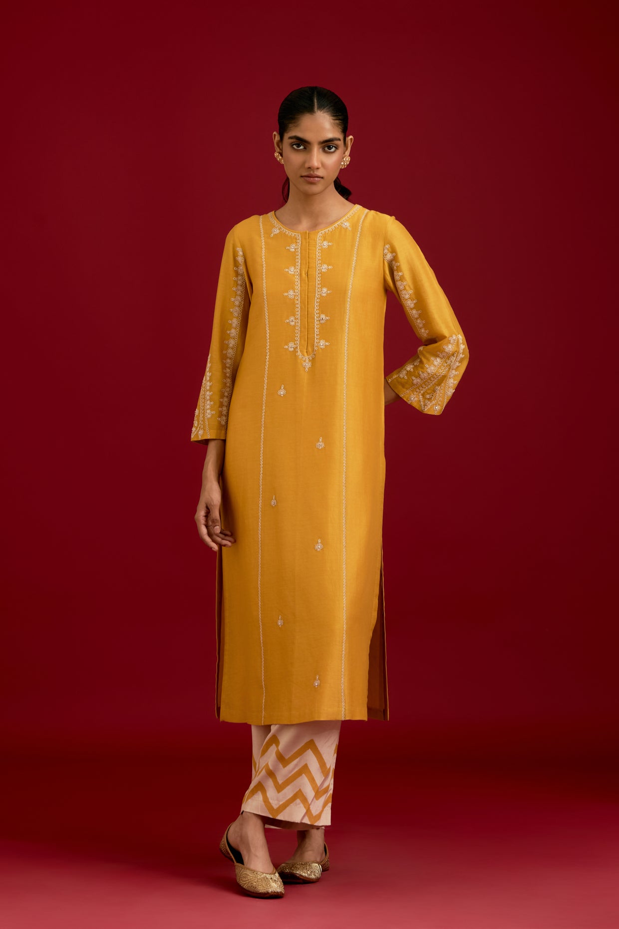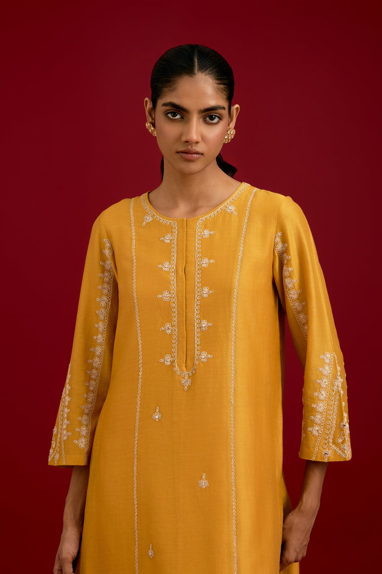 Mustard Cotton Silk Blend Embroidered Kurta Set