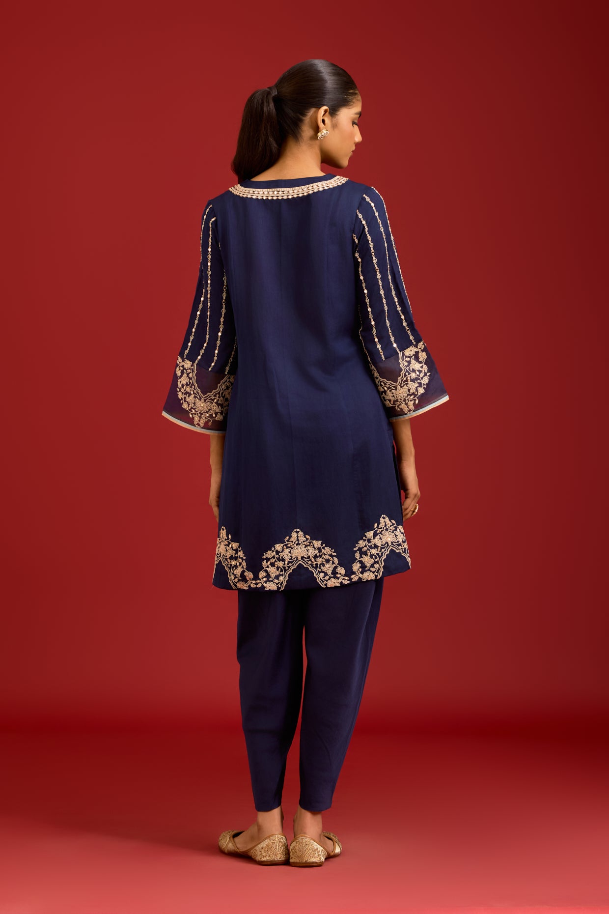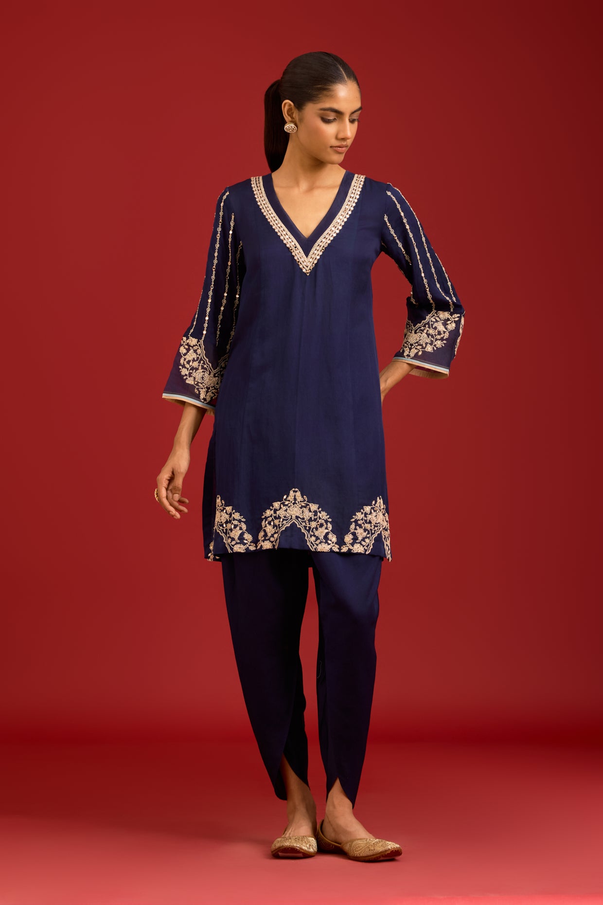In a navy blue tone, this refined short kurta and dhoti pants set in luxurious cotton silk satin with sequins,mirror work and dori embroidery is paired with an ombre crepe dupatta, adding a touch of subtle gradient elegance to this classic ensemble.