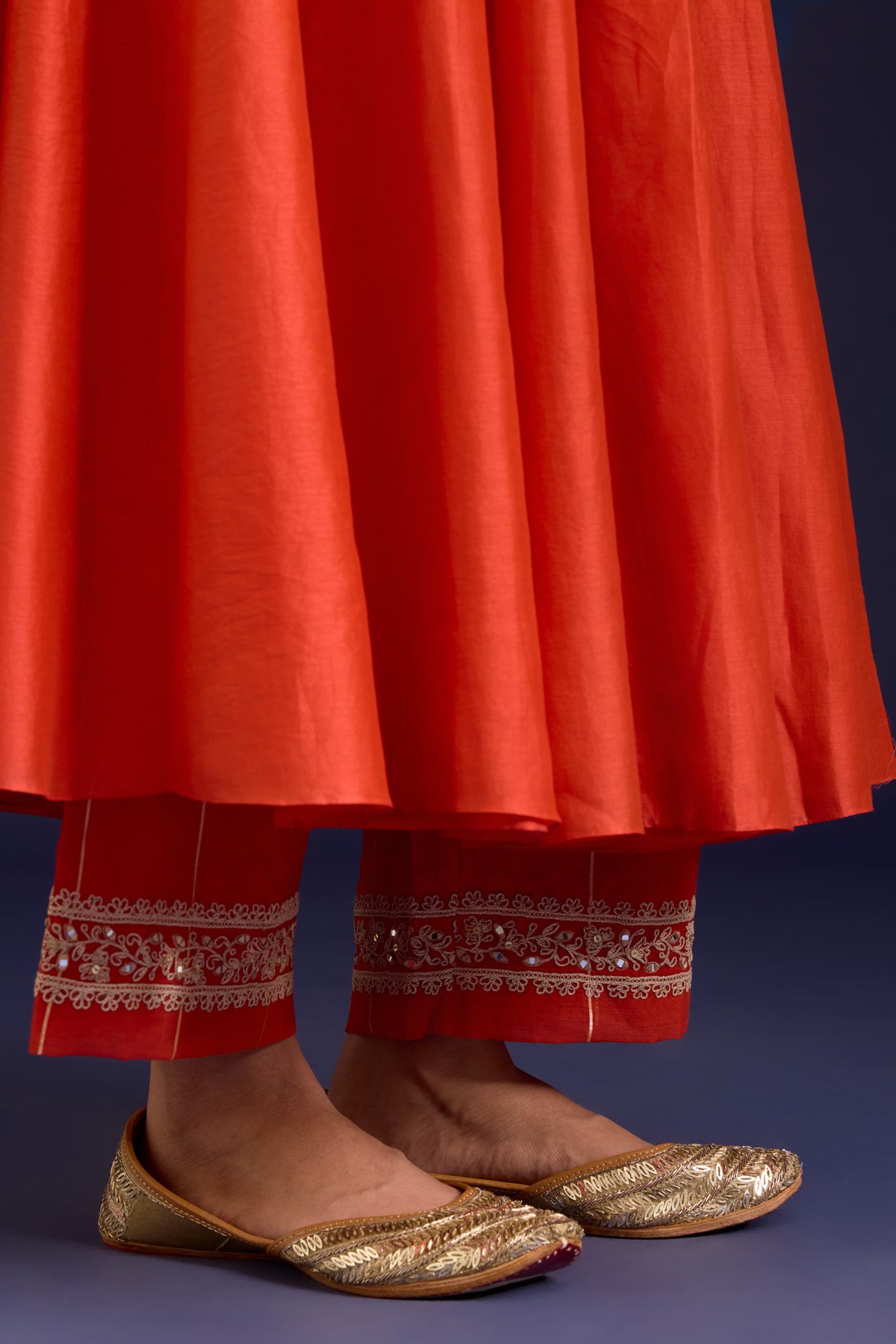 This vibrant orange anarkali and striped chanderi pants set in luxurious silk Chanderi boasts intricate dori embroidery, mirror, and sequin detailing, exuding elegance and sophistication. Paired with an organza dupatta featuring beautiful dori work, this stunning ensemble makes a majestic statement.