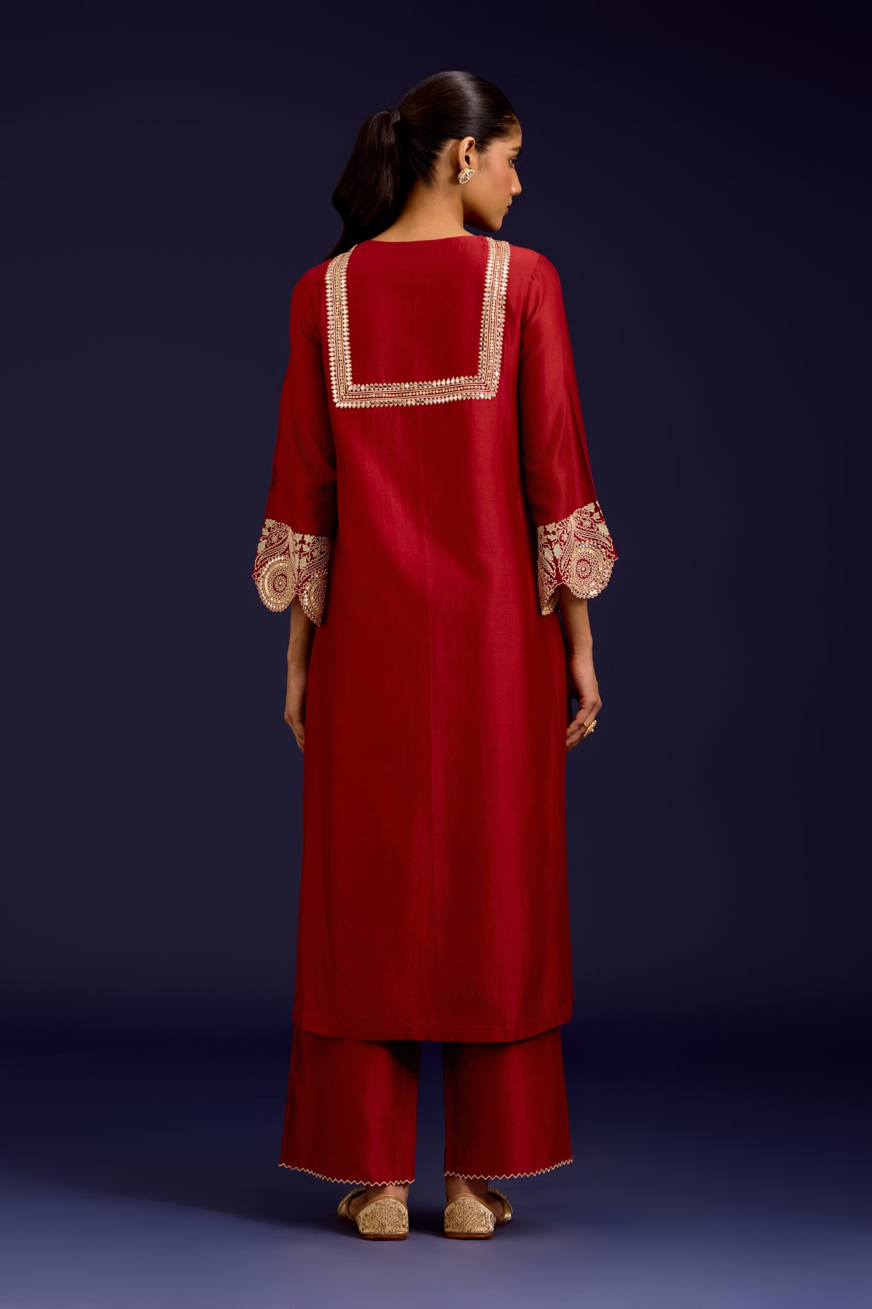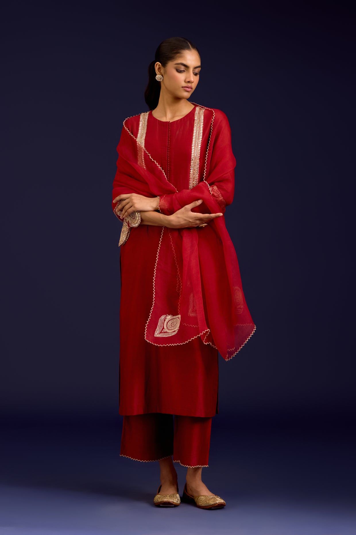A rust silk Chanderi kurta and palazzo pant, intricately embellished with dori embroidery, sequins, and mirror work, paired with an organza dupatta featuring delicate dori embroidery. This ensemble masterfully blends artistry and elegance.