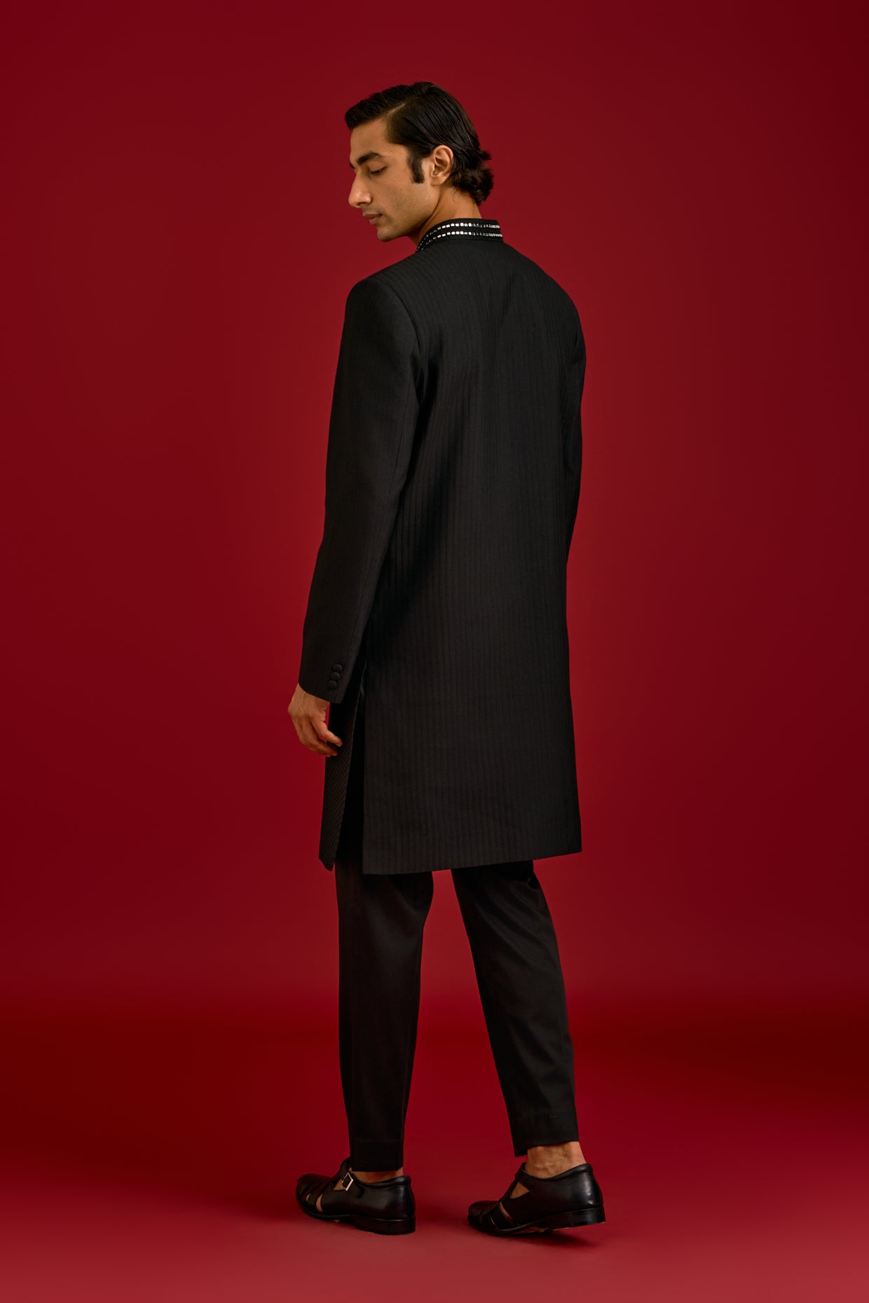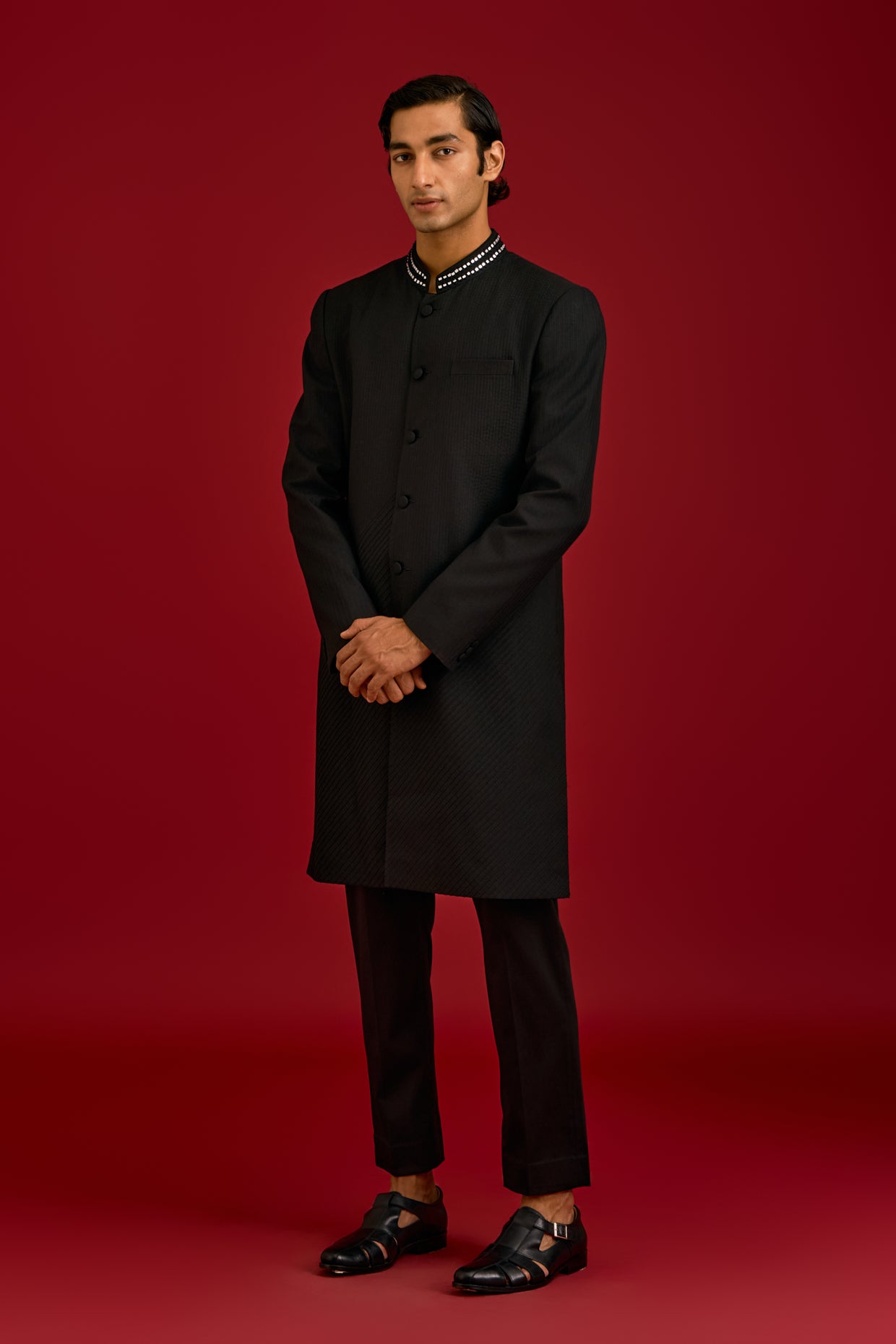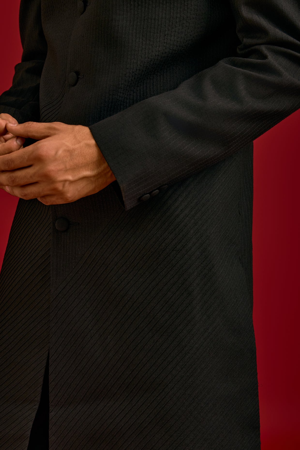 The all-black pin-tuck sherwani set embodies sleek sophistication, its cotton silk blend fabric draping with effortless elegance. Intricate detailing adds a touch of refinement, making this ensemble a timeless and stylish choice for wedding