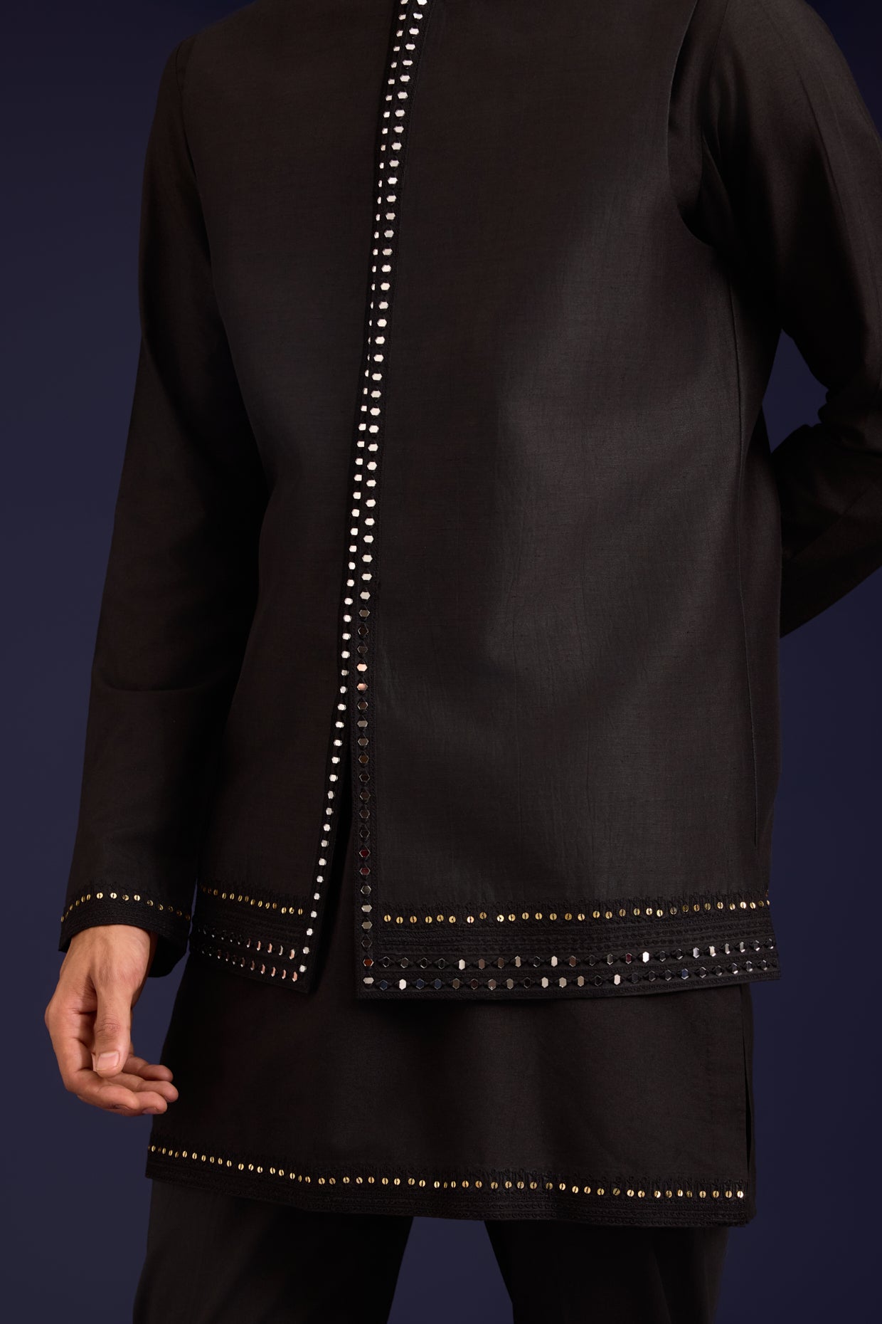Timeless elegance unfolds in this all-black Bundi set, where a linen satin Bundi and cotton silk blend kurta converge in perfect harmony. With intricate mirror work, sequins, and dori embroidery adding a touch of sophistication, this ensemble exudes refined beauty from every detail.