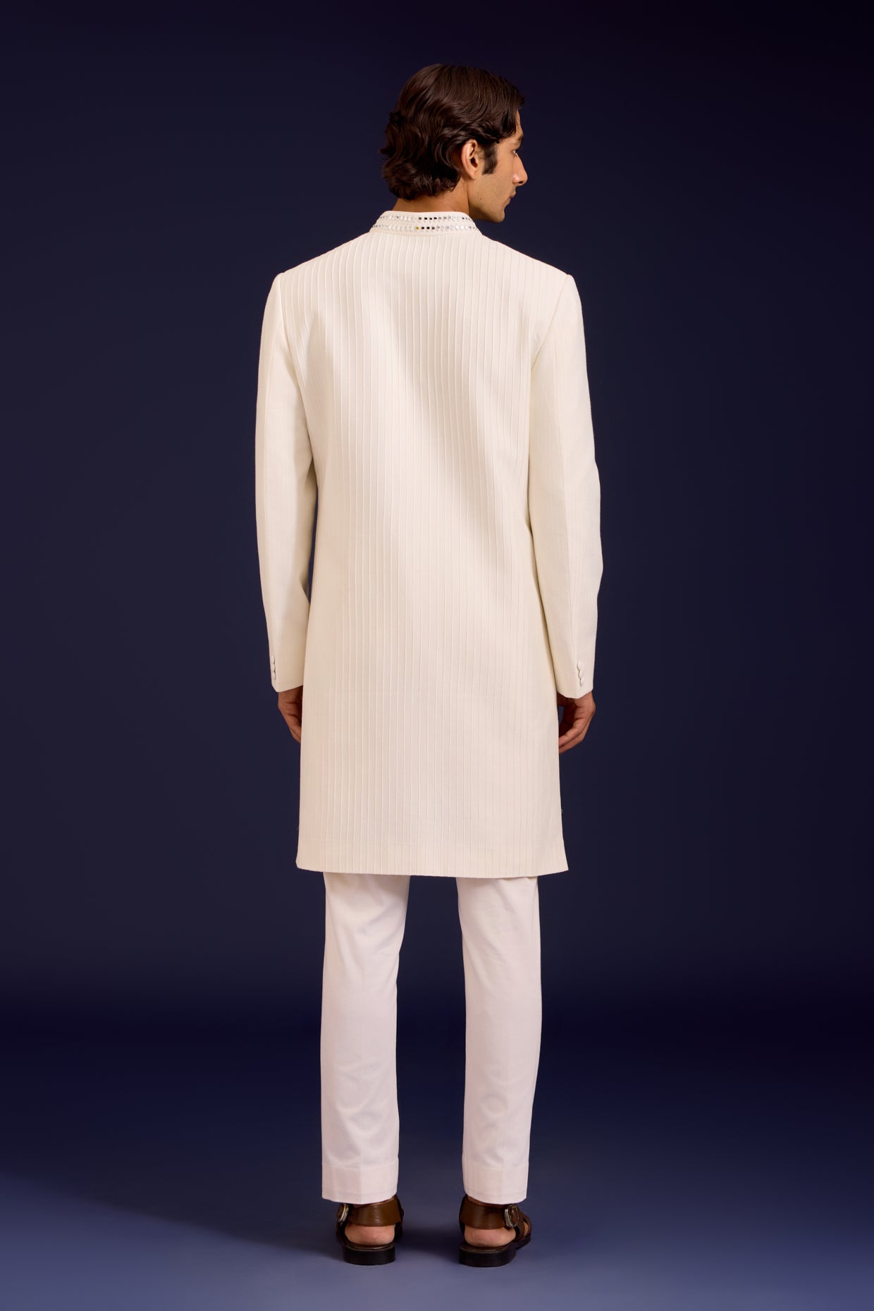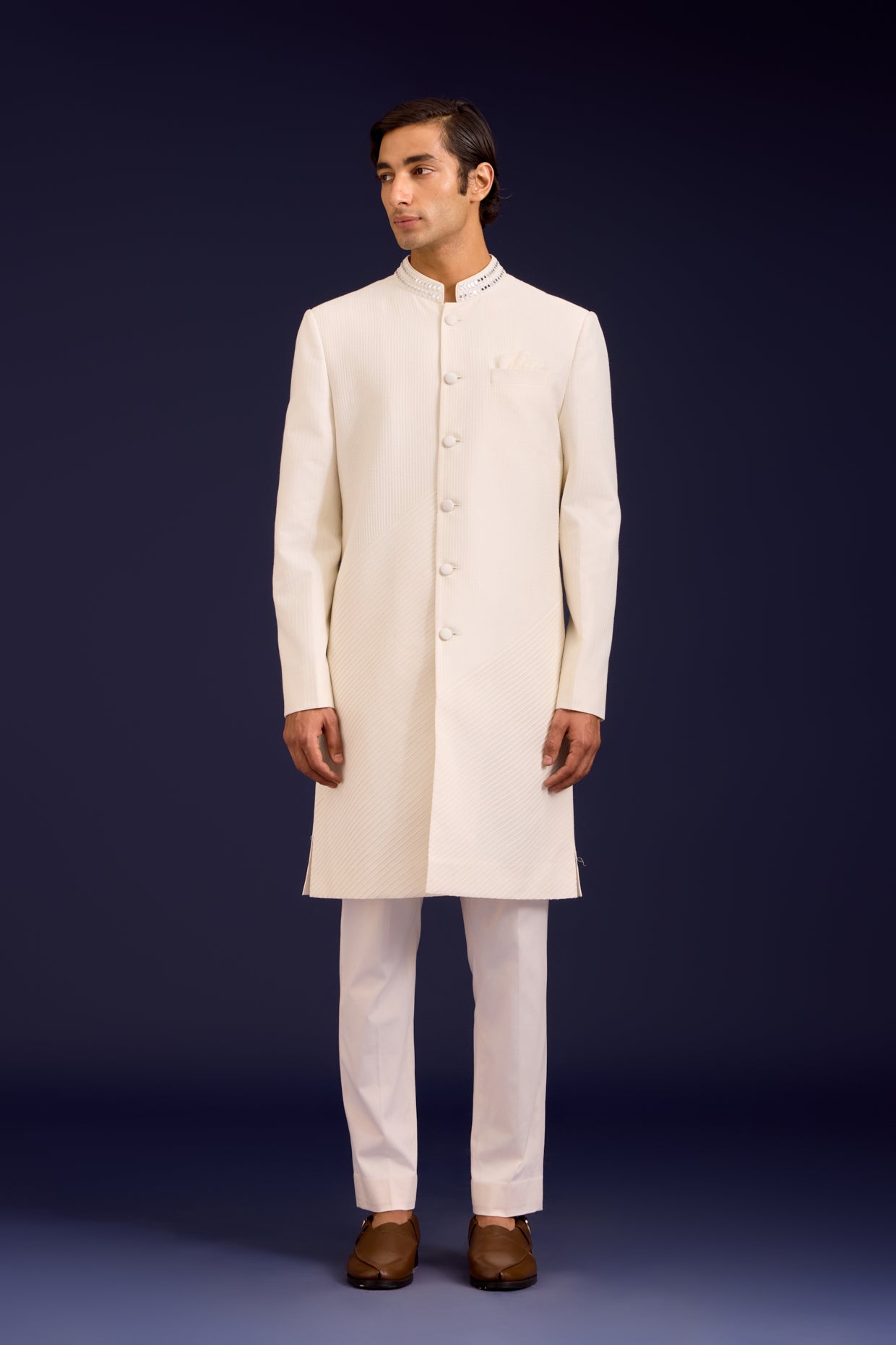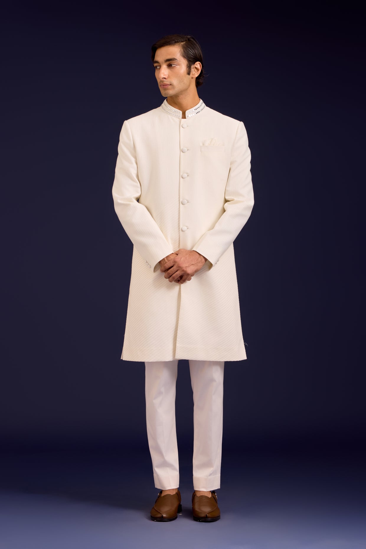 This ivory sherwani set exudes refined elegance, its soft hue and cotton silk blend fabric draping effortlessly. The sherwani features delicate pin-tuck detailing, adding subtle texture and depth. Intricate detailing adds a touch of sophistication, making this all-ivory ensemble a masterpiece of understated beauty.