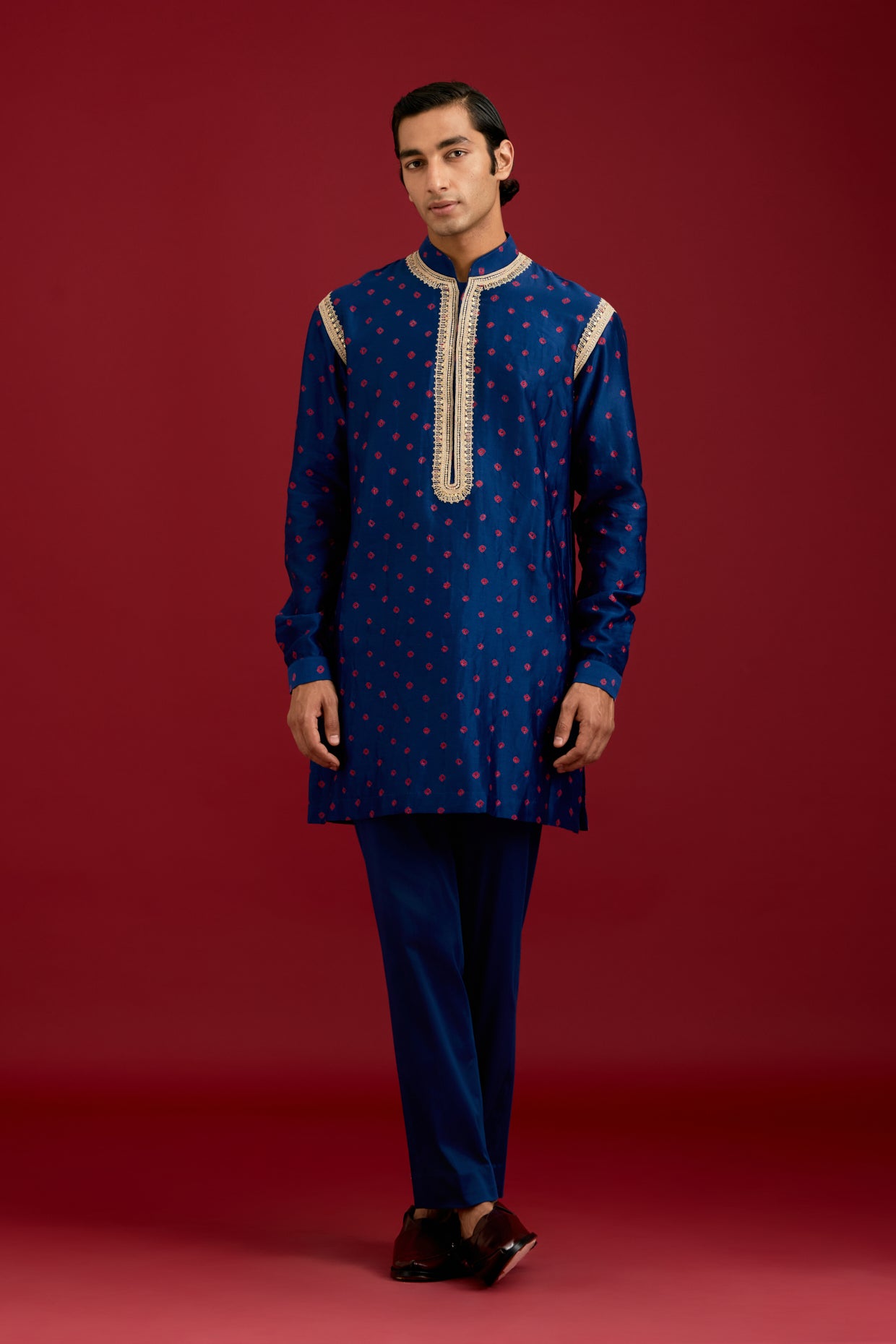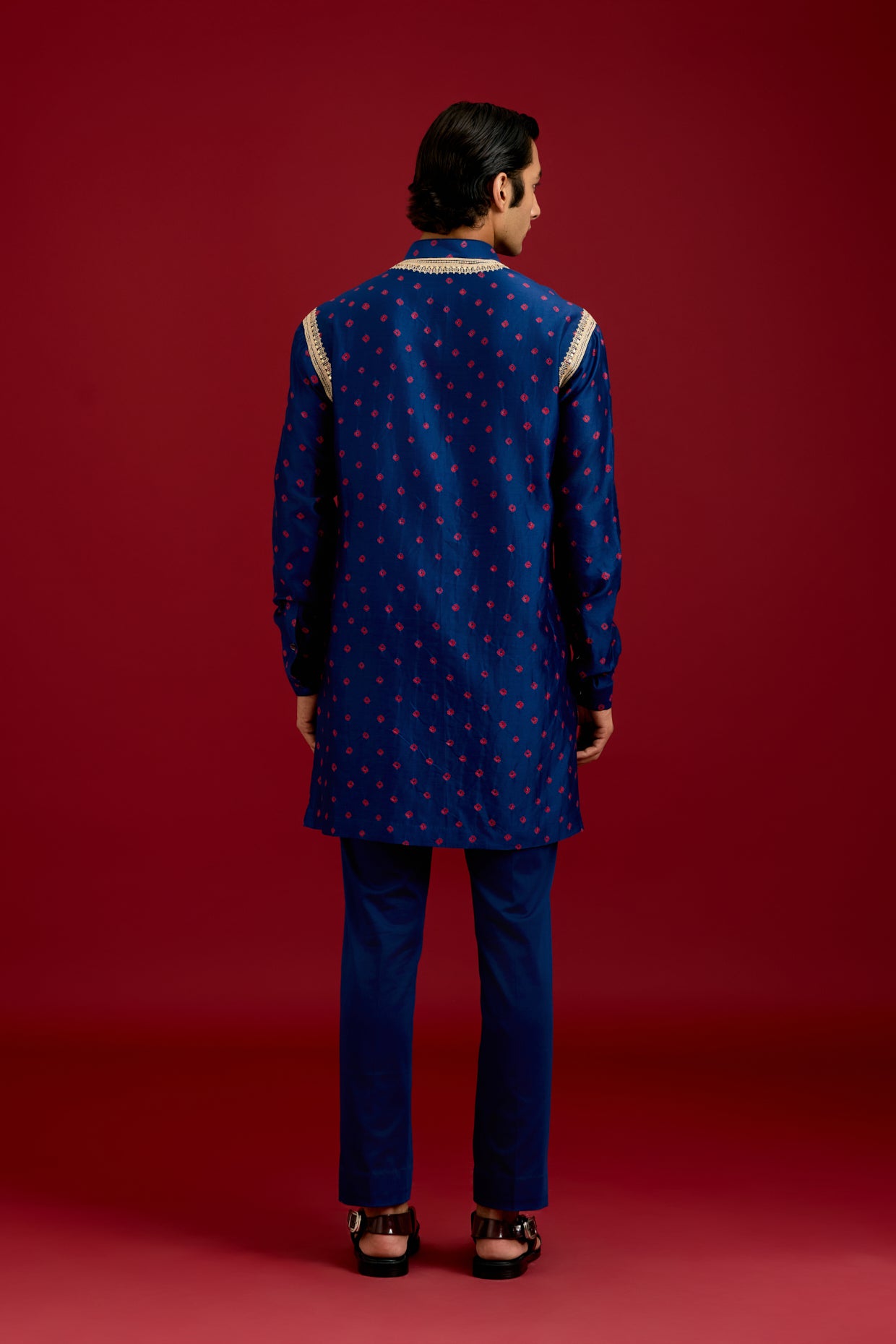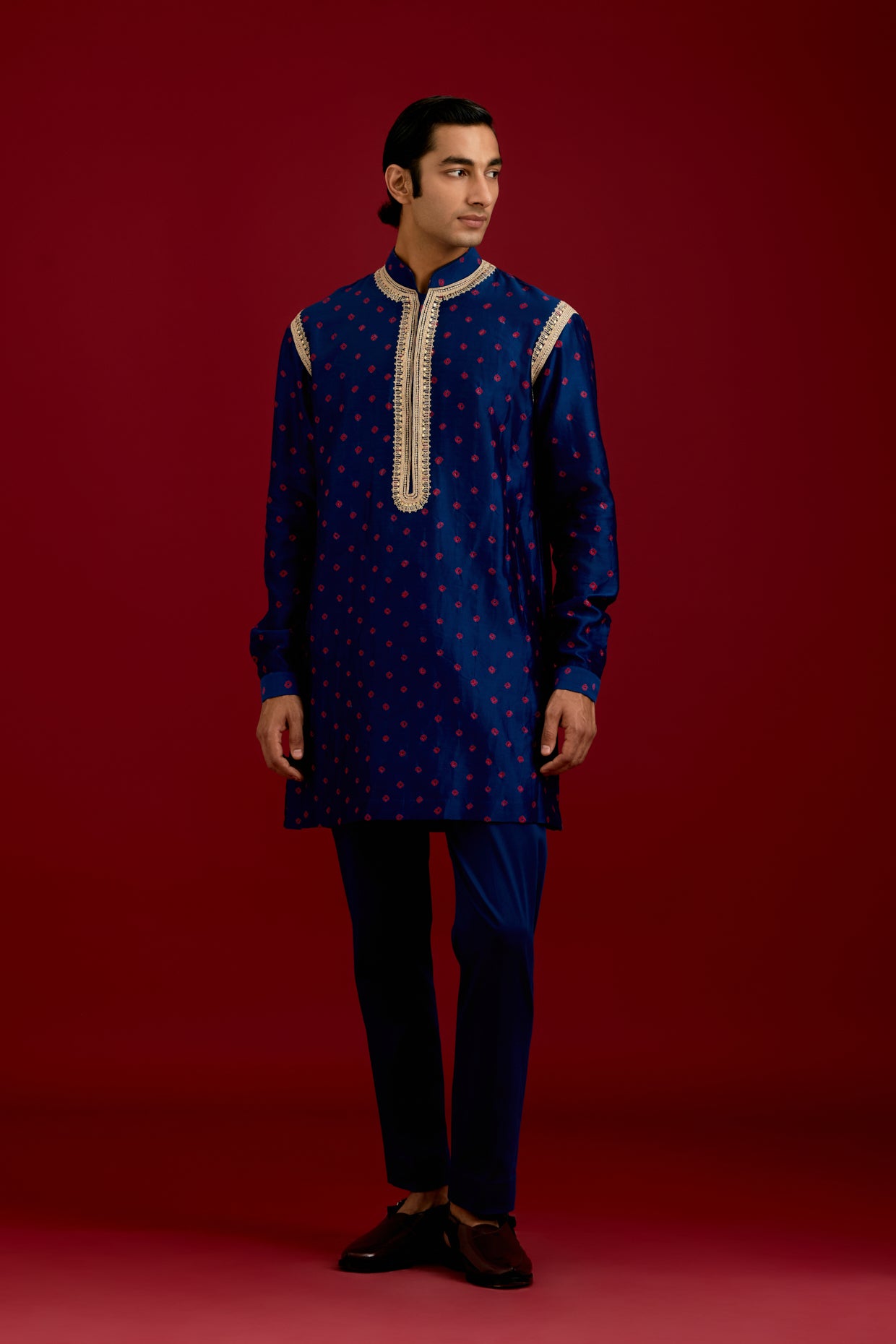 Make a statement with this elegant navy blue Chanderi Bandhej kurta set, featuring intricate mirror work, sequins, and dori embroidery, perfectly complemented by a matching slim pant for a refined and sophisticated look at special occasions.