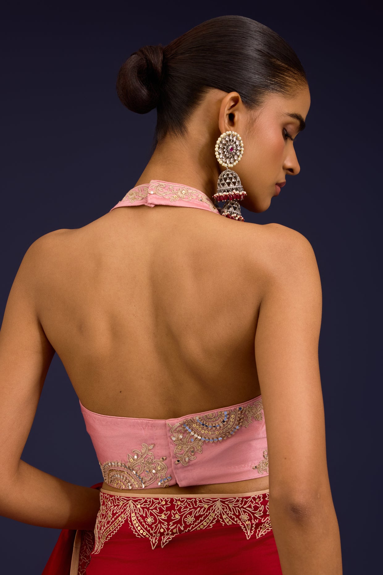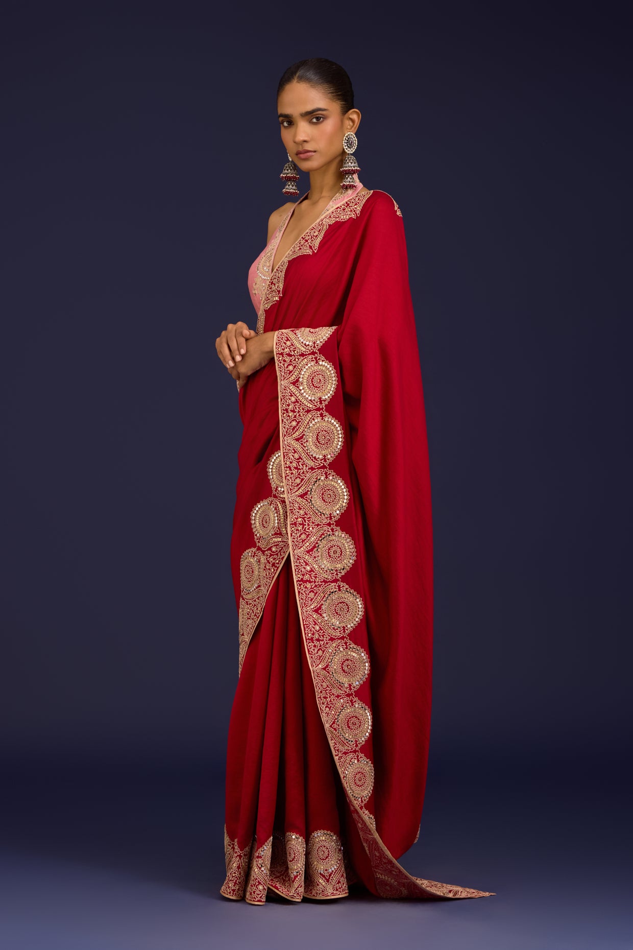 Our stunning red Chinniya silk saree is paired with a delicate pink Chinniya silk blouse. Dori embroidery, sequins, and mirror work come together in perfect harmony, creating a masterpiece that radiates elegance and charm.