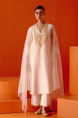 The ivory kurta set features exquisite mustard dori embroidery over the neckline and the delicate self printed chanderi base. The kurta is paired with a matching embroidered shantoon palazzo and an organza dupatta.