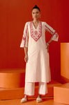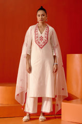 The ivory kurta set features exquisite red dori embroidery over the neckline and the delicate self printed chanderi base. The kurta is paired with a matching embroidered shantoon palazzo and an organza dupatta.