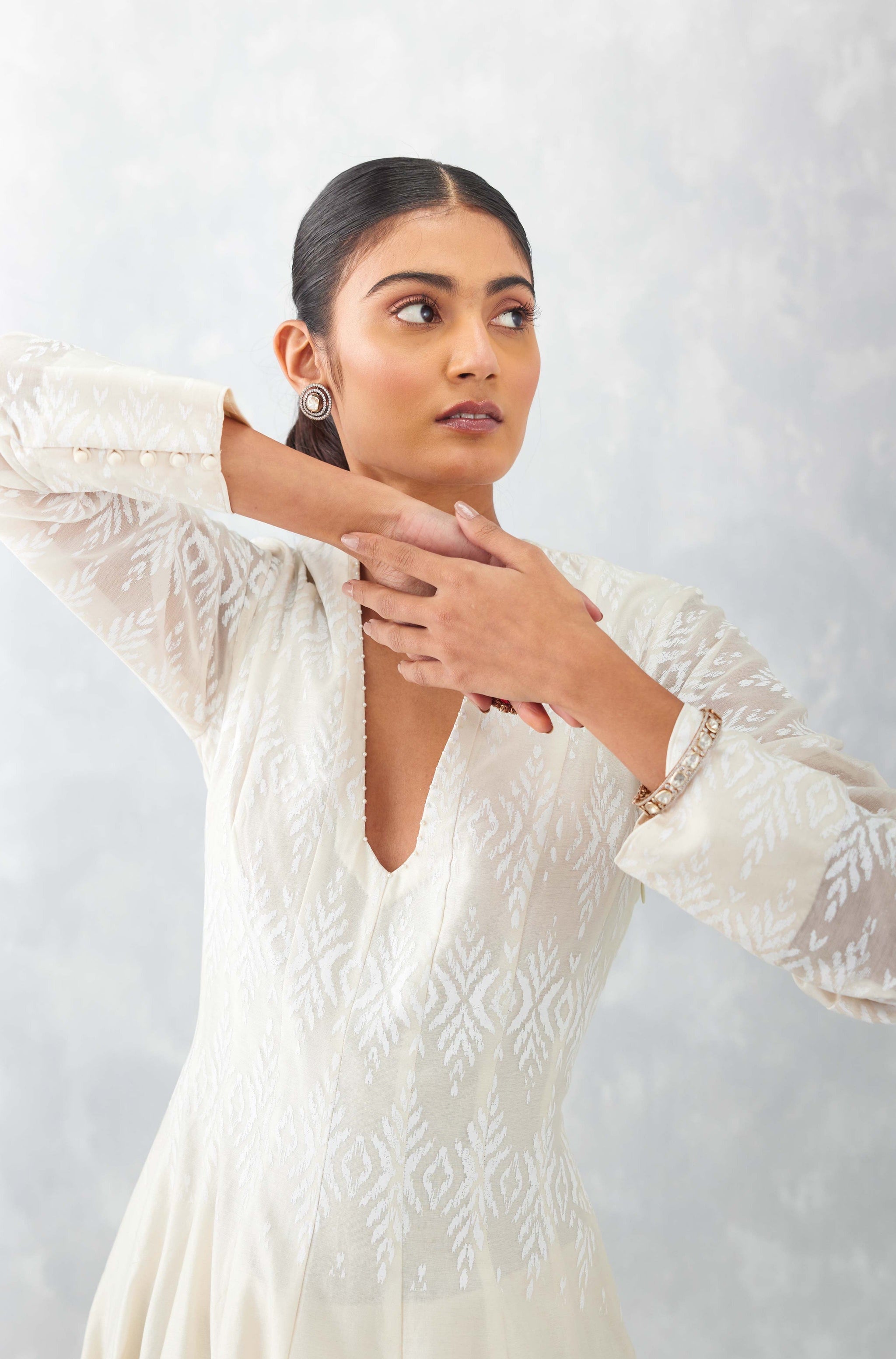 The ivory embroidered anarkali set features timeless ikat print with pearl details on its neckline and full sleeves along with the embroidered base. The delicate chanderi base comes with a beautiful flair, and is paired with a straight shantoon palazzo with organza details and an intricately embroidered organza dupatta.