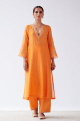 The orange embroidered kurta set features intricate dori and sequins embroidery on its neckline and sleeves. The beautiful block print base comes paired with an embroidered straight palazzo and a contemporary hand block print dupatta with tassels.