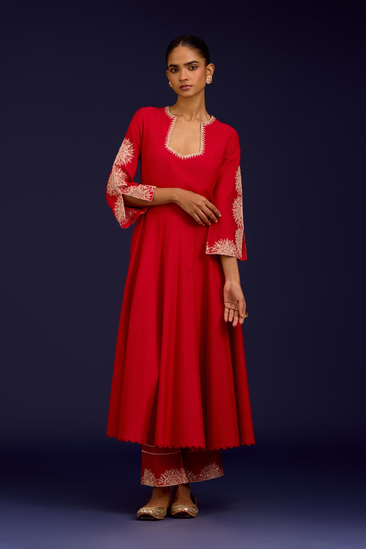 Red Cotton Silk Blend Embroidered Anarkali Set